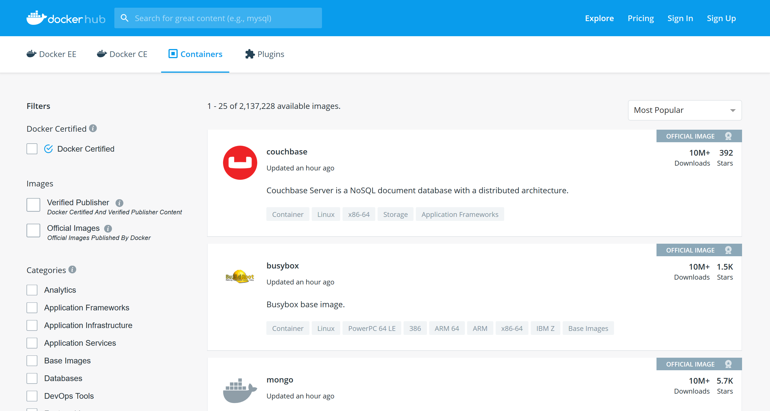 Right after you’ve installed docker on your machine you would want to try it out, head over to DockerHub and find a container you want to use. it could be a database or service you use.